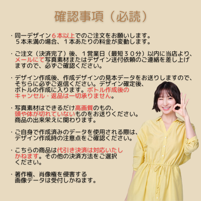 デザイン確定が伸びると発送も遅れますのでその点ご了承ください。注意事項については