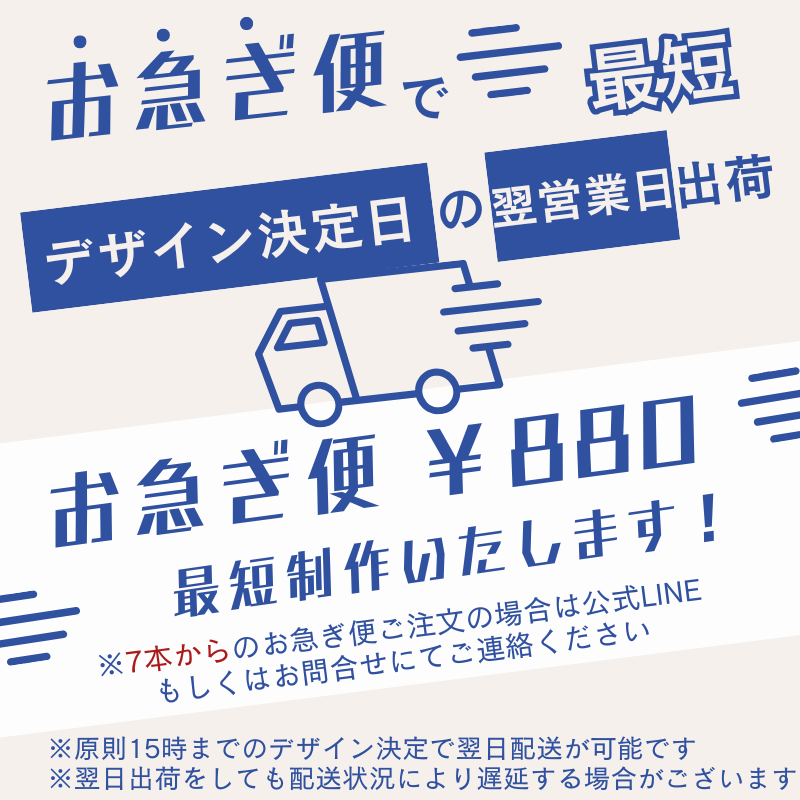 納期:デザイン確定後3営業日以内に発送(お急ぎ便+880円で翌営業日出荷OK) ※7本以上はお急ぎ便の価格が変動します